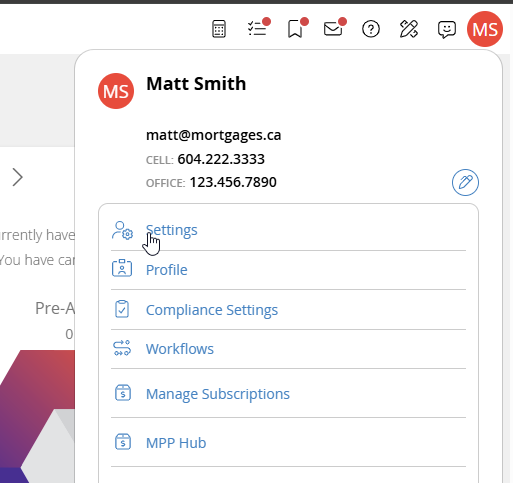 1. Click on your initials at the top right and select Settings.